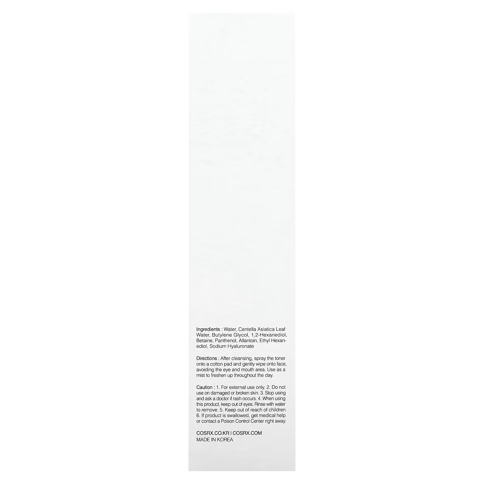ماء، ماء أوراق كينتيللا اسياتيكا، بوتيلين جلايكول، 1،2-هيكسانيديول، بيتين، بانثينول، ألانتوين، إيثيل هيكسانيديول، هيالورونات الصوديوم.