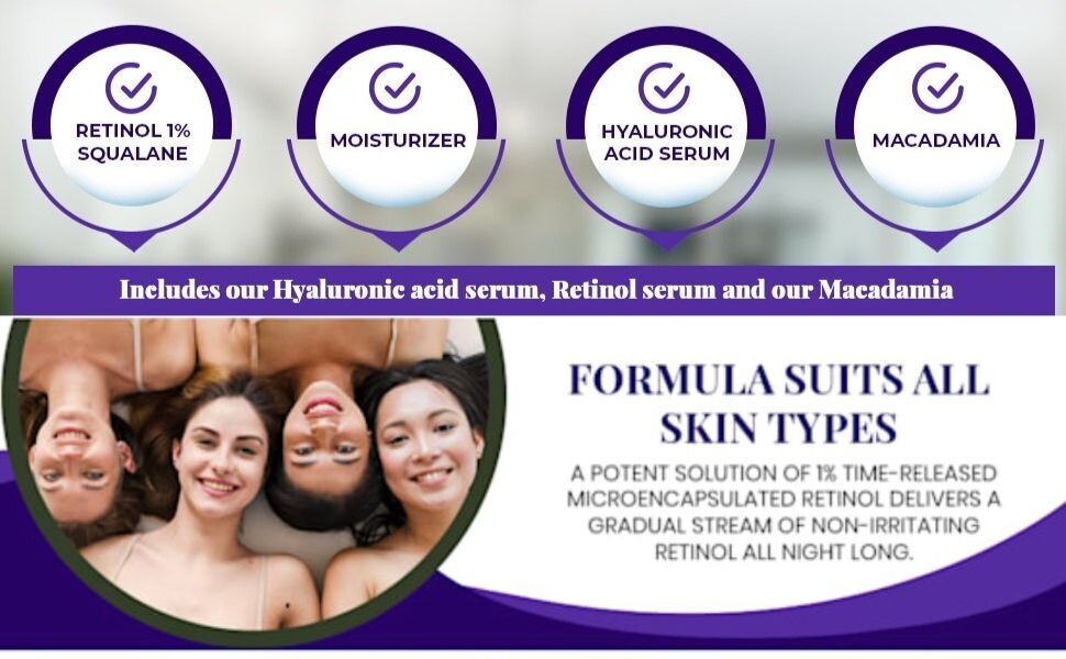 يوفر المحلول القوي بنسبة 1% من الريتينول المغلف بالكبسولات والذي تم إطلاقه بمرور الوقت تدفقًا تدريجيًا من الريتينول غير المهيج طوال الليل للمساعدة بشكل واضح في تحسين مظهر الخطوط الدقيقة والتجاعيد وتفاوت لون البشرة وملمسها وإشراقها. هذه التركيبة المرطبة غنية بالمكاديميا المضادة للأكسدة وحمض الهيالورونيك وغيرها من العناصر الطبيعية، وهي تناسب جميع أنواع البشرة.