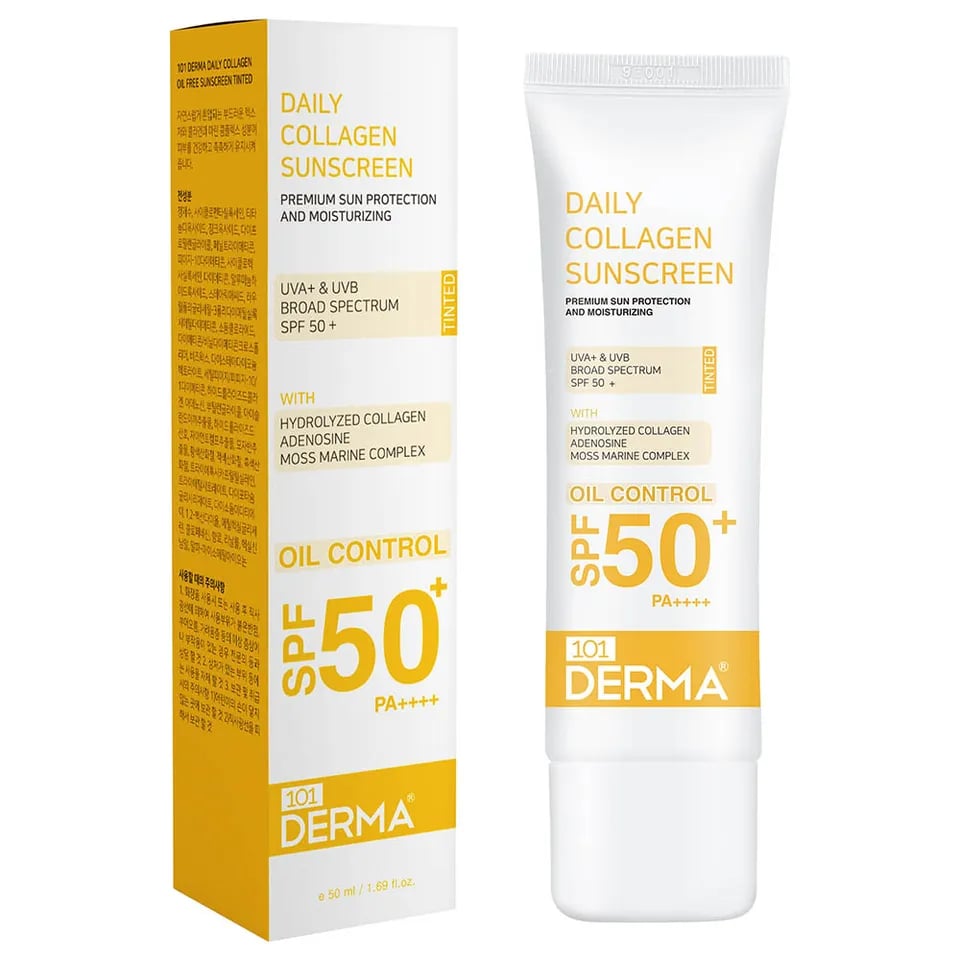101 DERMA DAILY COLLAGEN OIL FREE SUNSCREEN TINTED تعمل النغمات الطبيعية مع واقي الشمس ذو الملمس الناعم، كما تساعد مكونات الكولاجين والمجمع البحري في الحفاظ على بشرتك صحية ورطبة.