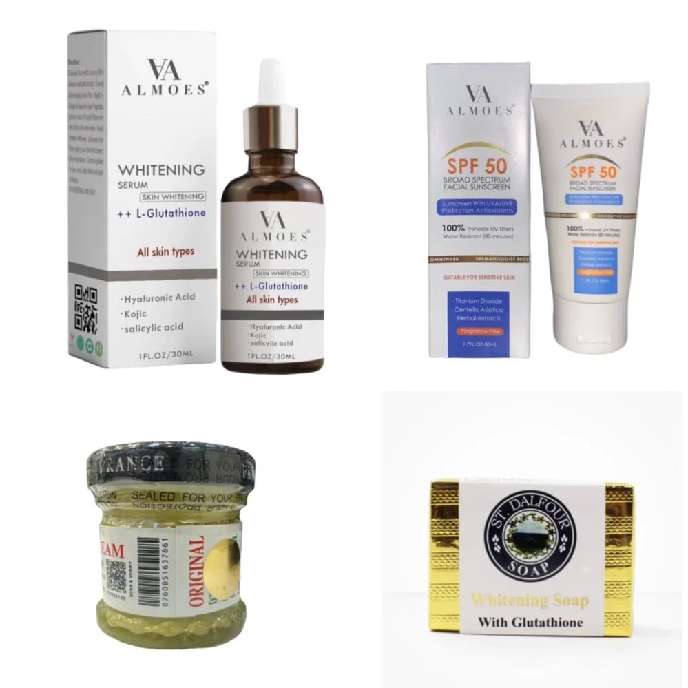 - تحتوي المجموعة على 4 منتجات تساعدك في تفتيح بشرتك وإزالة البقع والتجاعيد منها.