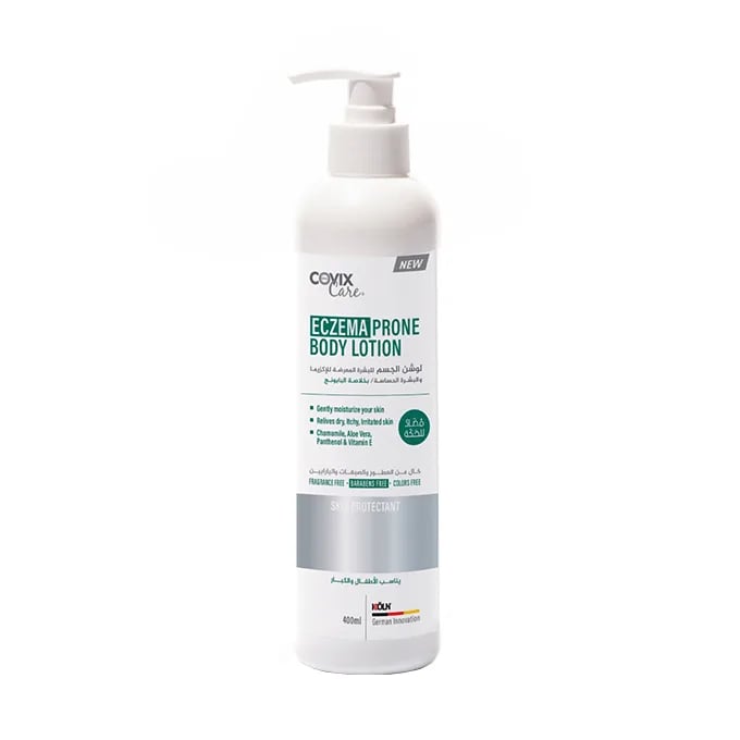 احصلي على كوفيكس كير لوشن الجسم للبشرة الحساسة أو المصابة بالإكزيما. يتكون من الصبار والبابونج ومزيج من فيتامين E. يحتوي على البانثينول والألانتوين الذي يعمل على ترطيب البشرة بعمق.