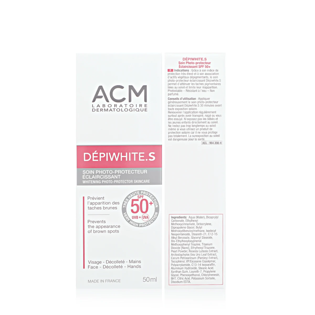 يتميز ACM Dépiwhite S بتركيبة تجمع ما بين التفتيح + الحماية العالية من الشمس SPF50+،