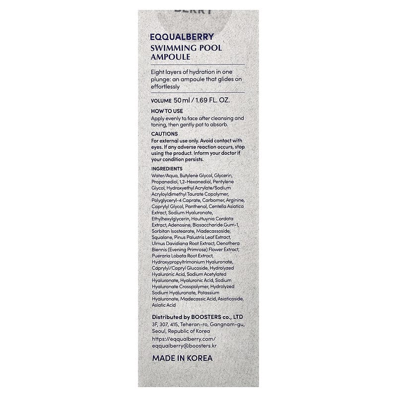 إذا كانت بشرتك تبدو مرهقة، عطشى، أو تعاني من شد وجفاف، فإن Eqqualberry Swimming Pool Ampoule هو الحل المثالي لإعادة التوازن والترطيب العميق للبشرة. بتركيبة غنية بمستخلصات نباتية مهدئة ومرطبات فعّالة، يمنح بشرتك ملمساً ناعماً ونضارة انتعاشية تماماً كما بعد الغطس في المسبح.