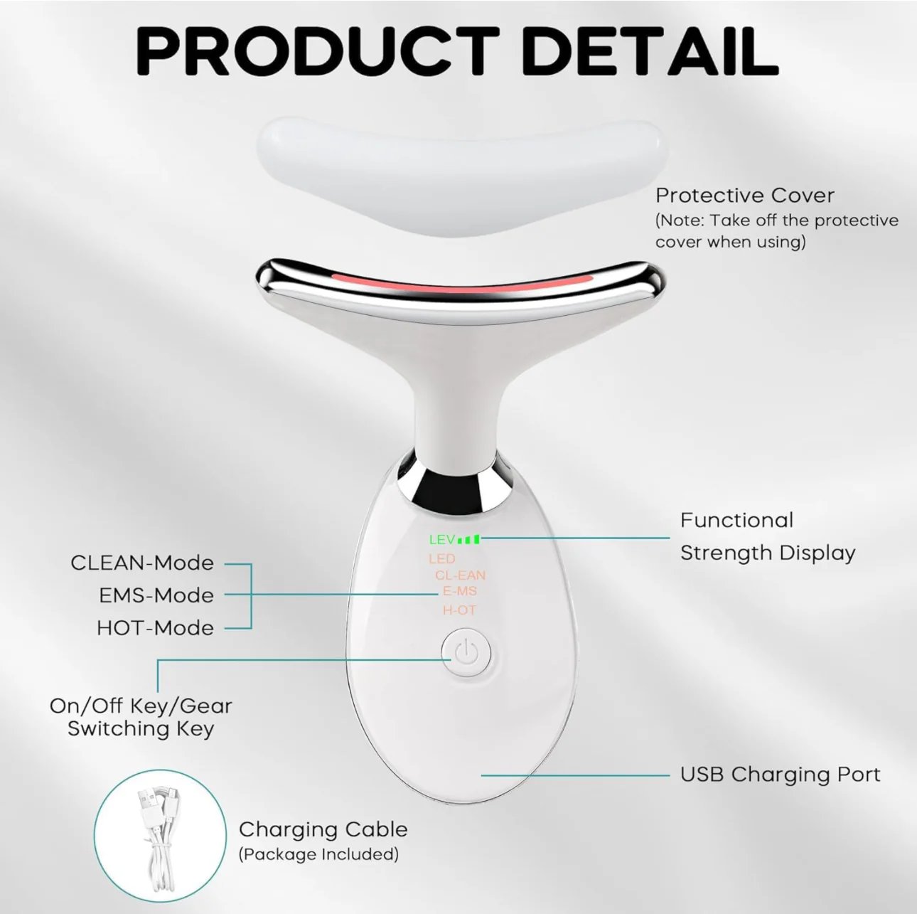 تحتوي آلة شد الوجه والرقبة على وظيفة ذاكرة الوضع، مع واجهة شحن USB، وهي آمنة ومريحة للاستخدام، ومناسبة لأي نوع من أنواع البشرة.