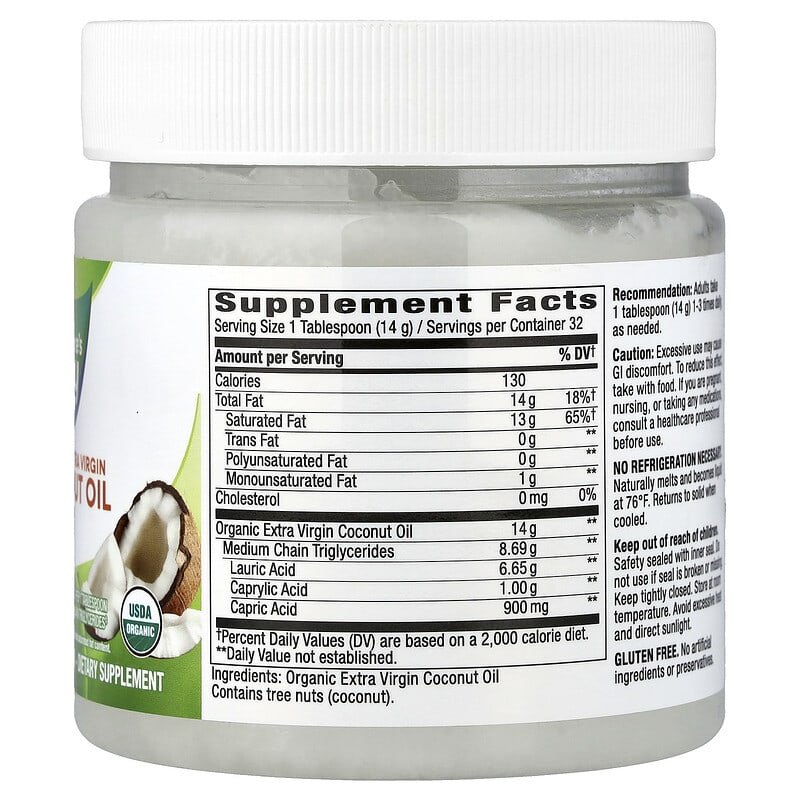 - 62٪ من الدهون الثلاثية متوسطة السلسلة (MCTs) +: 8.69 جم من الدهون الثلاثية متوسطة السلسلة (أحماض اللوريك والكابريليك وأحماض الكابريك) لكل جرعة / حصة من ملعقة كبيرة واحدة