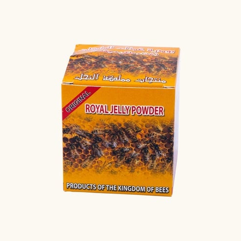 بودرة غذاء الملكات – مملكة النحل هو مادة هلامية صفراء اللون يفرزها النحل، تُجفف ثم تُطحن بطريقة فنية خاصة لتصبح بودرة ناعمة.