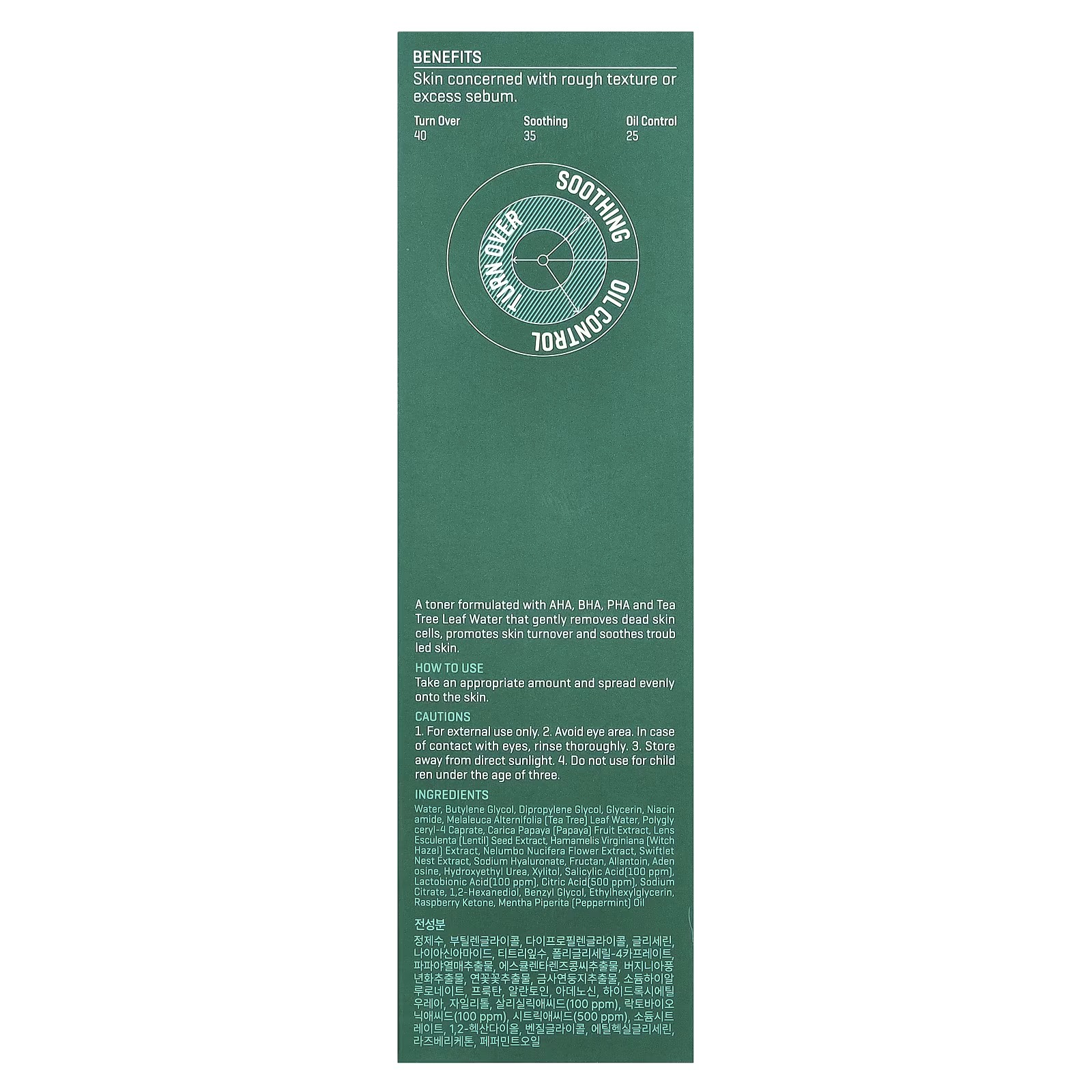 يحتوي على 10,000 جزء في المليون من شجر الشاي الأخضر ليتحكم بالإفرازات الدهنية الزائدة ويهدئ إحمرار البشرة، كما يحتوي على أحماض التقشير (ألفا، بيتا، وبولي هيدروكسي أسد) لتنظيف المسام وسطح البشرة من الأوساخ، الدهون، وخلايا البشرة الميتة المسببة لحب الشباب وتمنح البشرة ملمسا ناعماً..